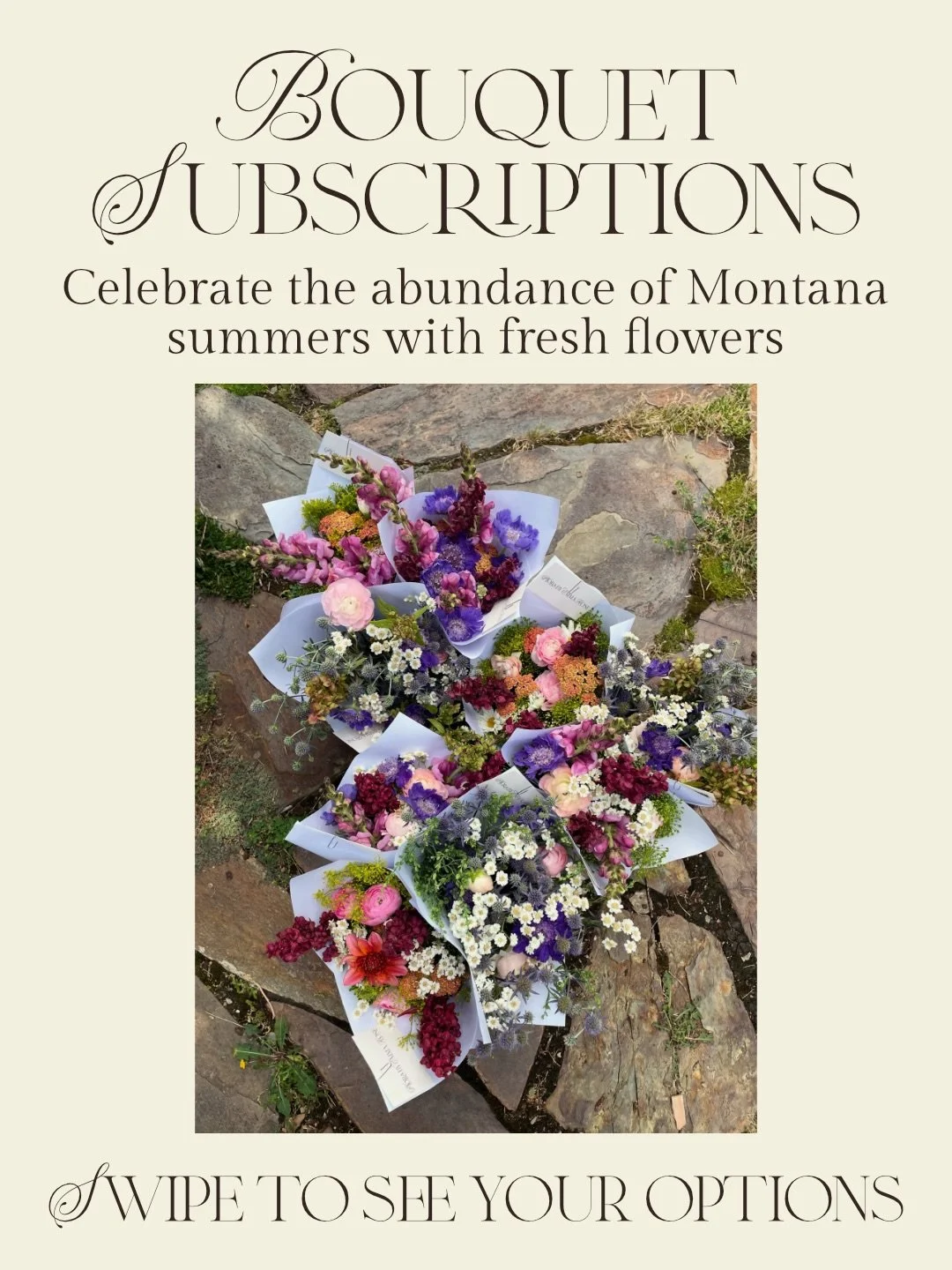 For those looking wanting to soak up the fleeting Montana summer without the commitment of a new bouquet every week. 5 weeks of a special collection of fresh, locally grown, seasonal blooms in a thoughtfully designed wrapped bouquet.